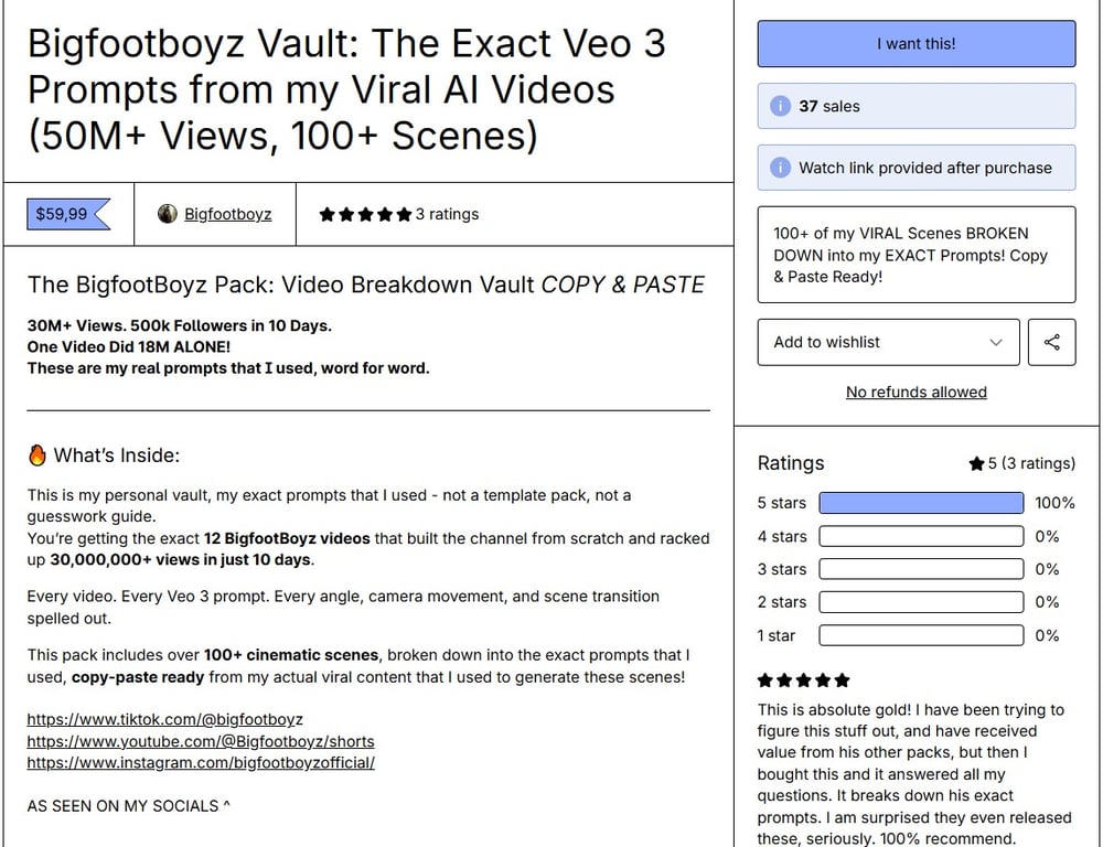 Bigfootboyz Vault is a collection of exact prompts used by the creator behind the wildly successful Bigfootboyz social media channels (on TikTok, YouTube Shorts, and Instagram Reels). These are the very Veo 3 prompts—complete with dialogue, camera angles, lighting setups, and scene transitions—that were used to produce viral content reaching over 50 million views.