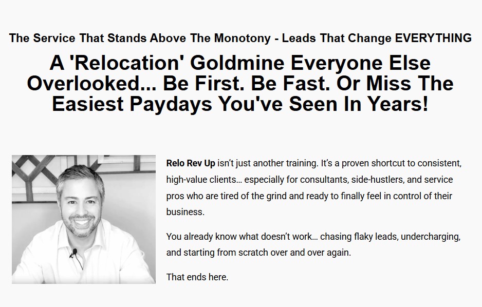 Relo Rev Up by Mike Paul is a specialized business training program designed to help consultants, service providers, and entrepreneurs consistently attract high-value clients from the overlooked relocation niche. Unlike generic marketing courses filled with fluff, this program delivers a step-by-step, proven system that shows you how to target motivated prospects, convert them with simple strategies, and create a sustainable income stream—without relying on complex ads, endless cold outreach, or advanced tech tools.