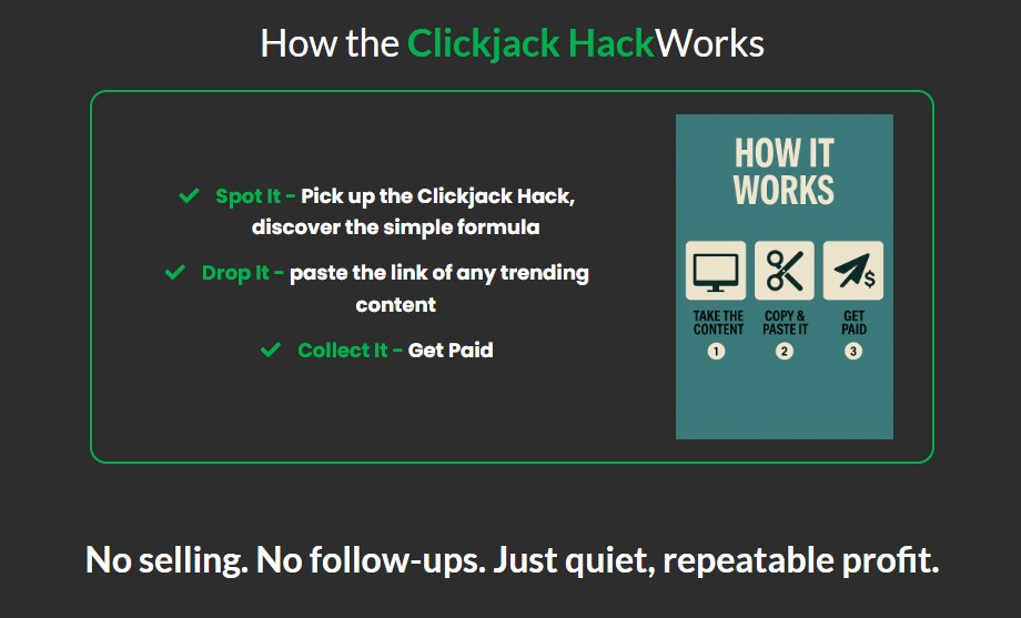 The Clickjack Hack is a step-by-step system that shows users how to earn money online by legally leveraging other people’s viral content—without creating anything from scratch, spending money, or even showing your identity. At its core, it relies on discovering trending content, dropping it into a “hidden” platform, and collecting payouts.