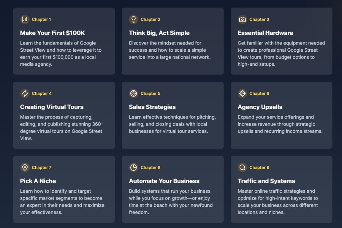 The first chapter lays the foundation for success by showing how anyone can turn basic Google Street View services into a six-figure business. It explains how to become a certified Street View photographer, navigate the Google ecosystem, and position yourself as an expert in local digital marketing. The focus here is not just theory, but practical steps that lead to tangible financial results.